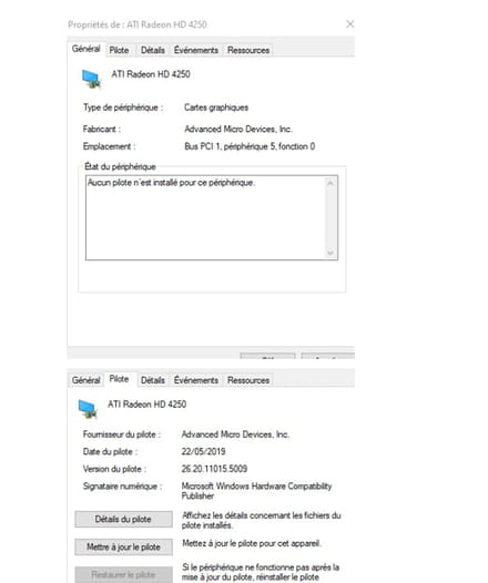 de plus dans ta capture d'écran, il est notifié qu'aucun pilote n'est installé pour ta carte graphique Ati Radeon HD 4250