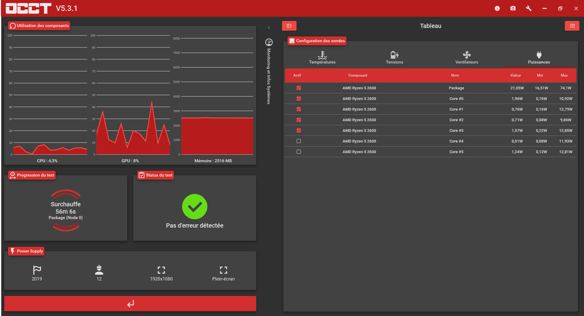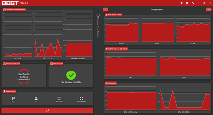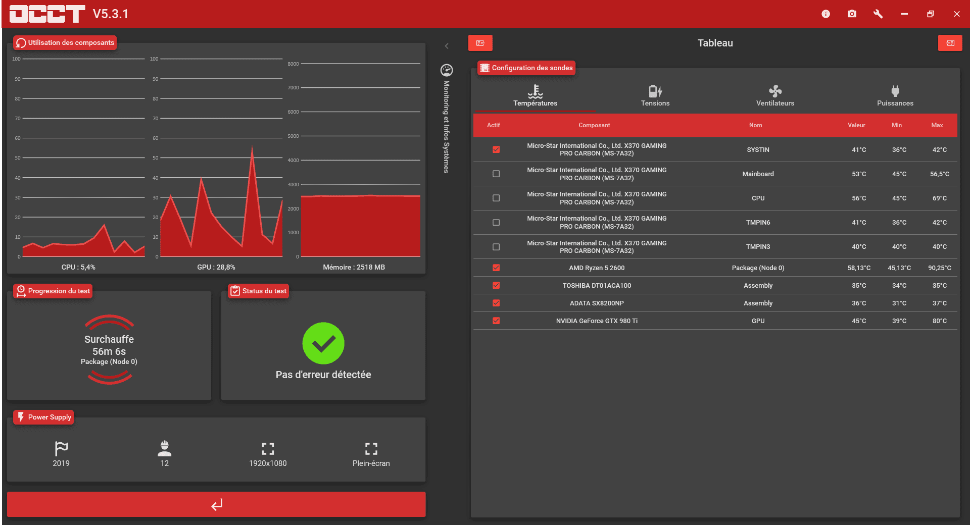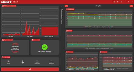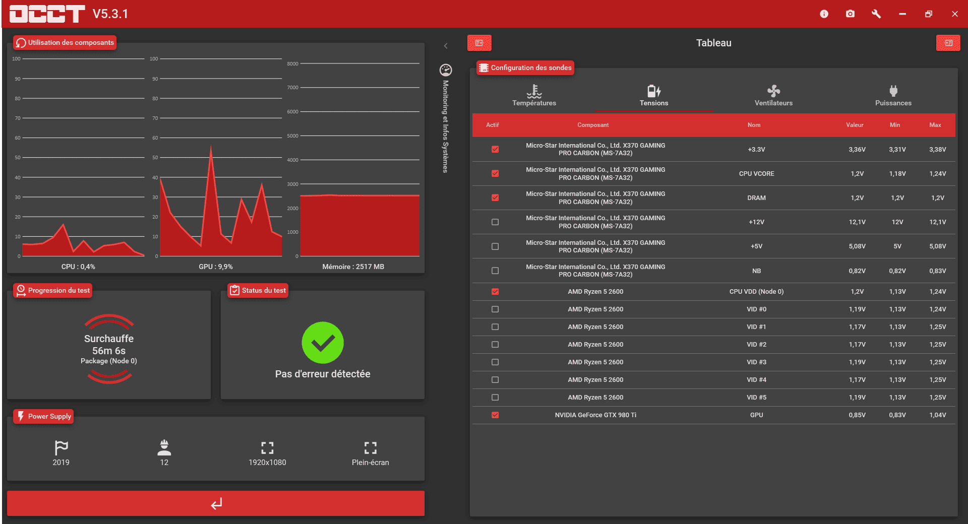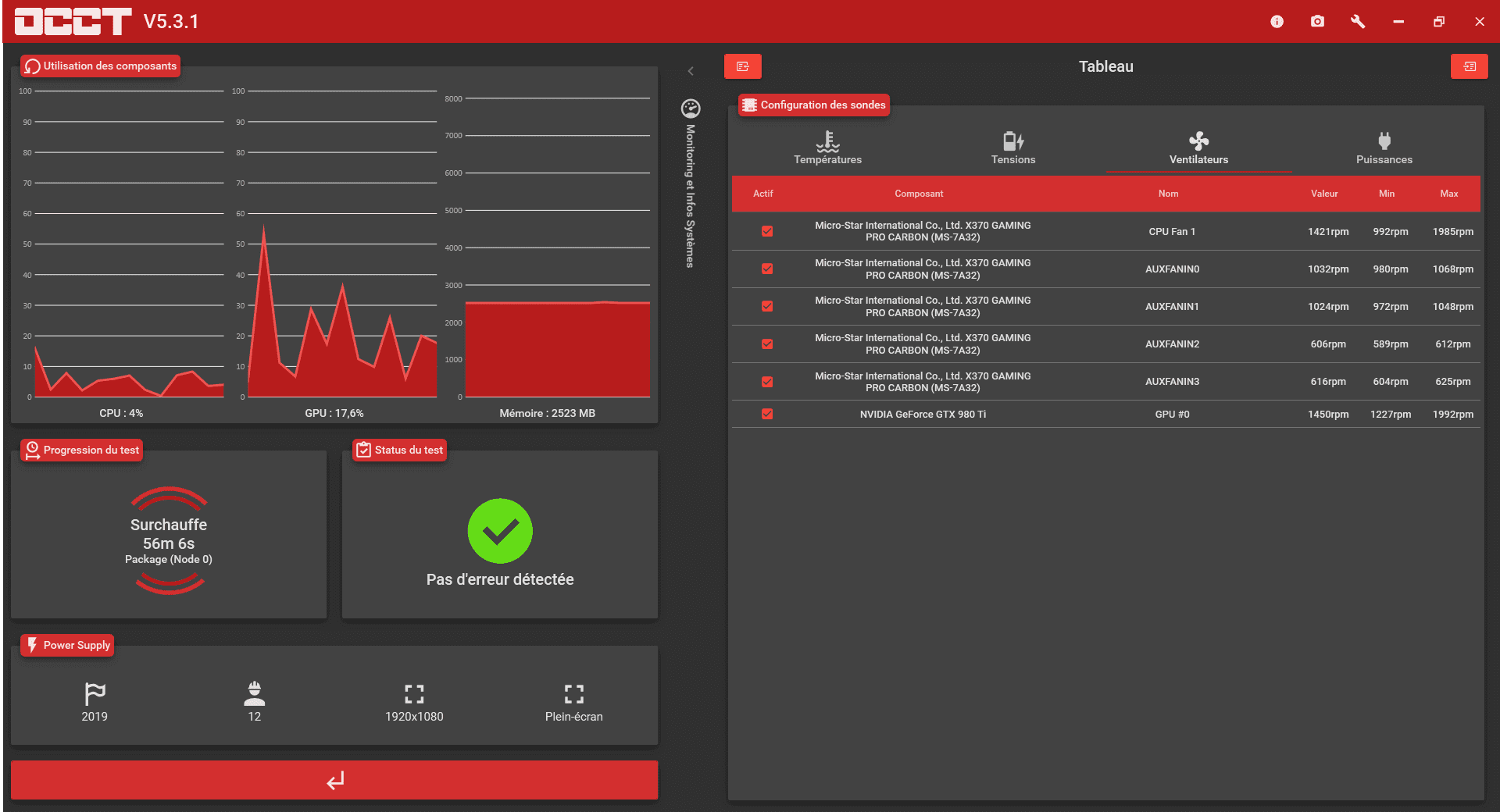 Pour la GPU, la temp max a été de 80°C, une tension max de 1,04V, des ventilateurs jusqu'à 2802 rpm mais je n'ai pas la puissance.
