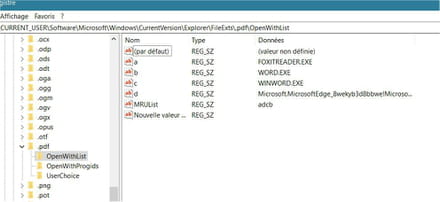bonjour, merci pour cette réponse rapide ! j'ai suivi tes instructions. dans regedit, dans la openwithlist de pdf, je vois que j'ai déjà winword en d !