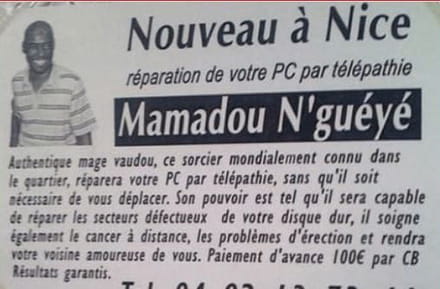 Je me souviens d'une publicité d'un "professeur" africain qui propose amour, santé, argent, désenvoutement et réparation d'ordinateur ! Quand je remettrai la main sur cette pub, je te l'enverrai.