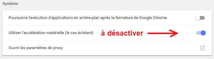 Dans Chrome : Paramètres --> Paramètres avancés --> descendre jusqu'à l'encart Système et là tu peux ou non décocher l'accélération matérielle :