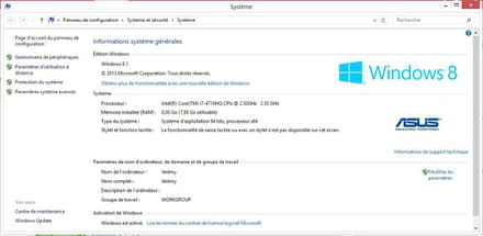 Mon PC est sous Windows 8.1 (je n'ai malheureusement jamais réussi à le mettre à jour sous Windows 10. Voici les caractéristiques du PC (écran système)