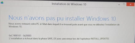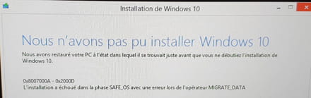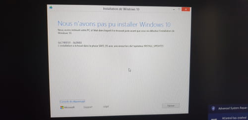 Pour la mise à jour de Windows 8.1 à 10, voici les images des messages d'erreurs en meilleure qualité. J'ai fais des photos car pas possible de faire des captures d'écran durant la phase d'installation de Windows 10