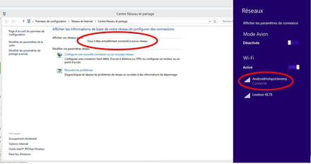 En revanche, quand je me connecte sur le partage de connexion de mon téléphone (AndroidHotSpot), il ne détecte pas le réseau dans l'écran "Centre réseau et partage", alors que je suis bien connecté dans le menu réseau (zone bleu à droite de l'image ci dessous)
