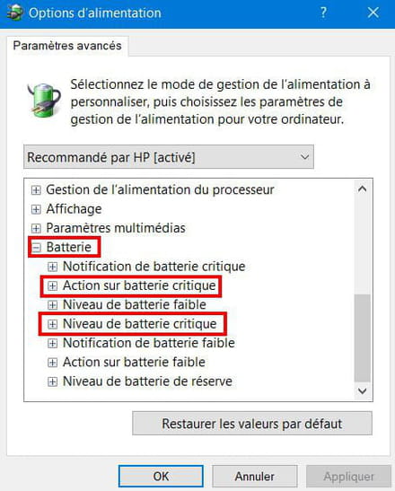 Dans la nouvelle fenêtre descendez tout en bas jusqu'à Batterie et cliquez dessus. Vous pourrez définir le niveau de batterie critique ainsi que l'action à effectuer.