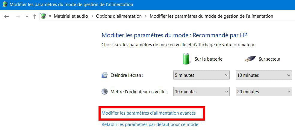 Dans la fenêtre qui s'ouvre cliquez sur Modifier les paramètre d'alimentation avancés.