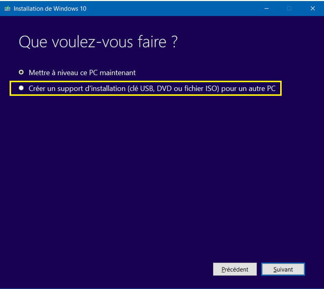 dans la page qui s'ouvre, choisi "créer 1 support d'installation"