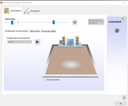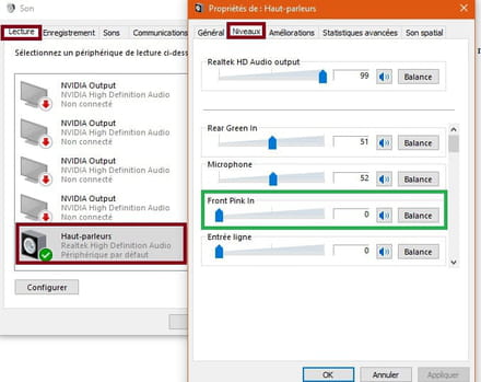 A- Sélectionne bien tes haut-parleurs Realteck par défaut (onglet Lecture).
