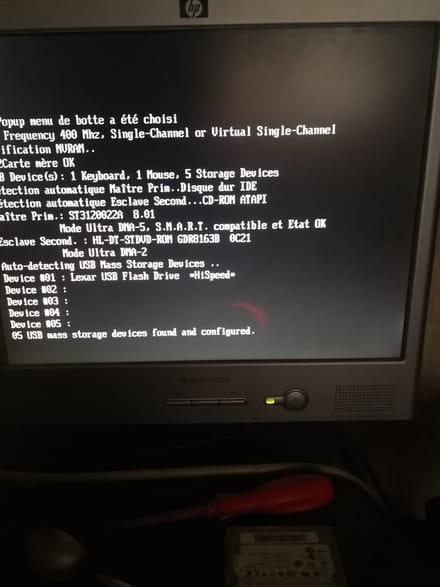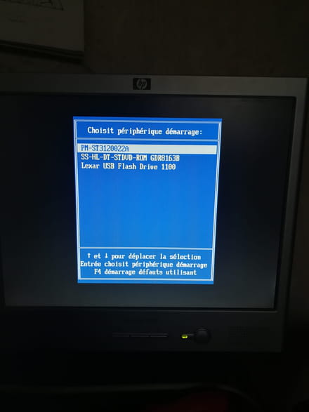 Voila une photo de ce que ca me fait donc quand je branche pour boot et que j’appuie sur échappe pour accéder au menu de démarrage :