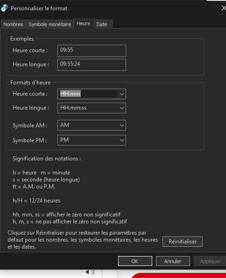 Est-il possible de changer le format de l'heure en format 12 heures (03:15:26 AM-PM) en restant en région France ?