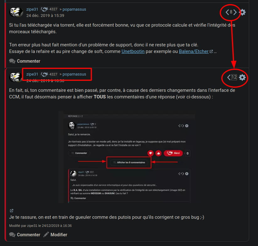 au bout de 6 commentaires sur une réponse, ils sont pliés, suivant le lien où l'on pointe (le #numéro que l'on peut voir sous la date du post) ou#dernier ou sur une réponse ou sur la question, on n'a pas le même affichage.