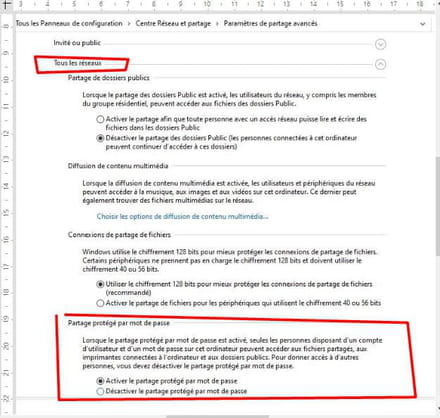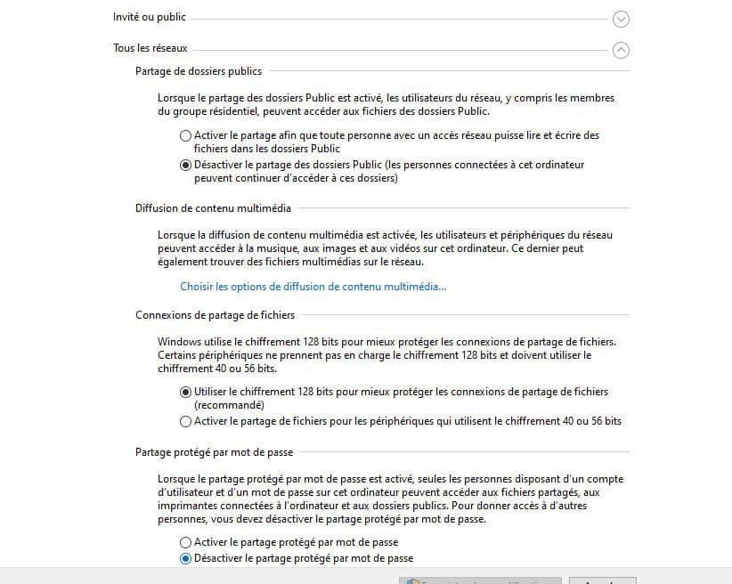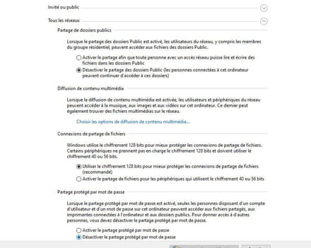 A propos de votre copie d'écran, vous êtes mis en réseau public, ce qui concerne les réseaux multi-sites d'entreprises, ce qui n'est pas votre cas et présente les risques d'intrusion que vous redoutez et que vous tentez de contrer en activant le cryptage. Je n'ai jamais utilisé ces options qui sont à éviter et servent en principe en configuration client/serveur, ce qui n'est pas votre cas.