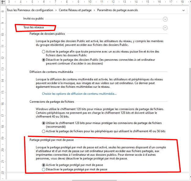 je dois pour accéder au dossier partagé, dans partages réseau du fixe, dans la 3ème rubrique (celle intitulée "tous les réseaux" par opposition aux deux premières, "réseau privé" et "invité ou public"), impérativement cocher la case "désactiver le partage protégé par mot de passe"