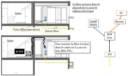 La fibre (jaune) arrivera dans le placard de l'entrée. De là je pensais tirer un RJ45 connecté au DTI pour amener la fibre au salon: