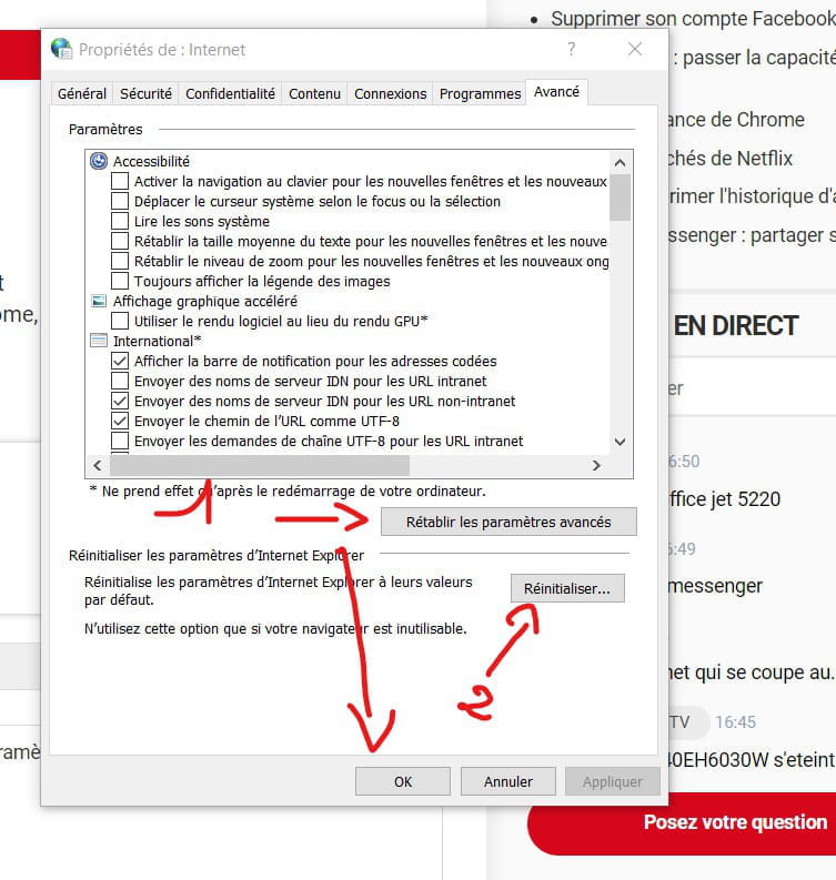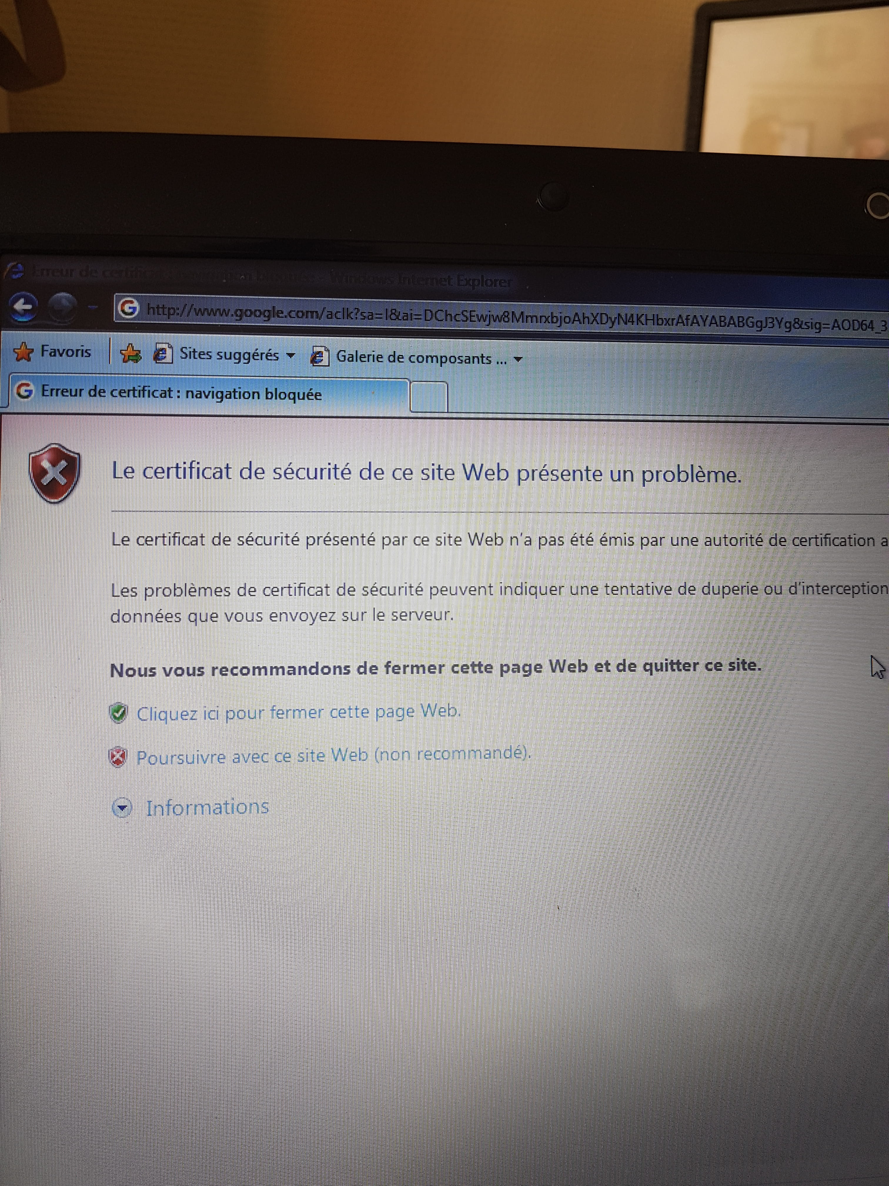 Depuis hier je ne peux plus aller sur internet avec mon ordi portable. Je suis connecté par wifi, le réseau est correct. L'heure idem. Car j'ai vue sur d'autre forum, que le problème viendrait car l'horloge n'était pas à l'heure. J'allume internet, je tape se que je veux (ex: antivirus) , j'ai un message avec une croix blanche sur fond rouge qui me dit : "Le certificat de sécurité de ce site web présente un problème".