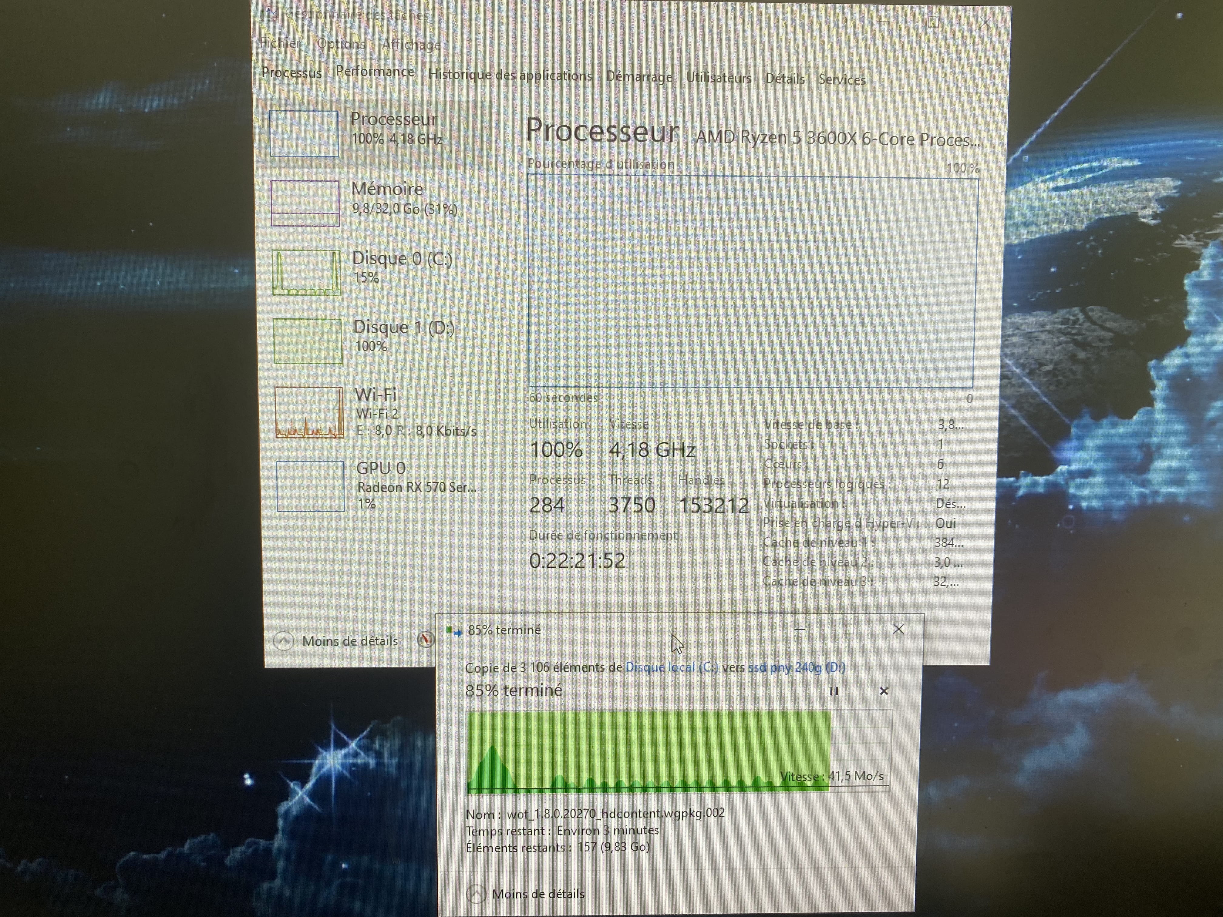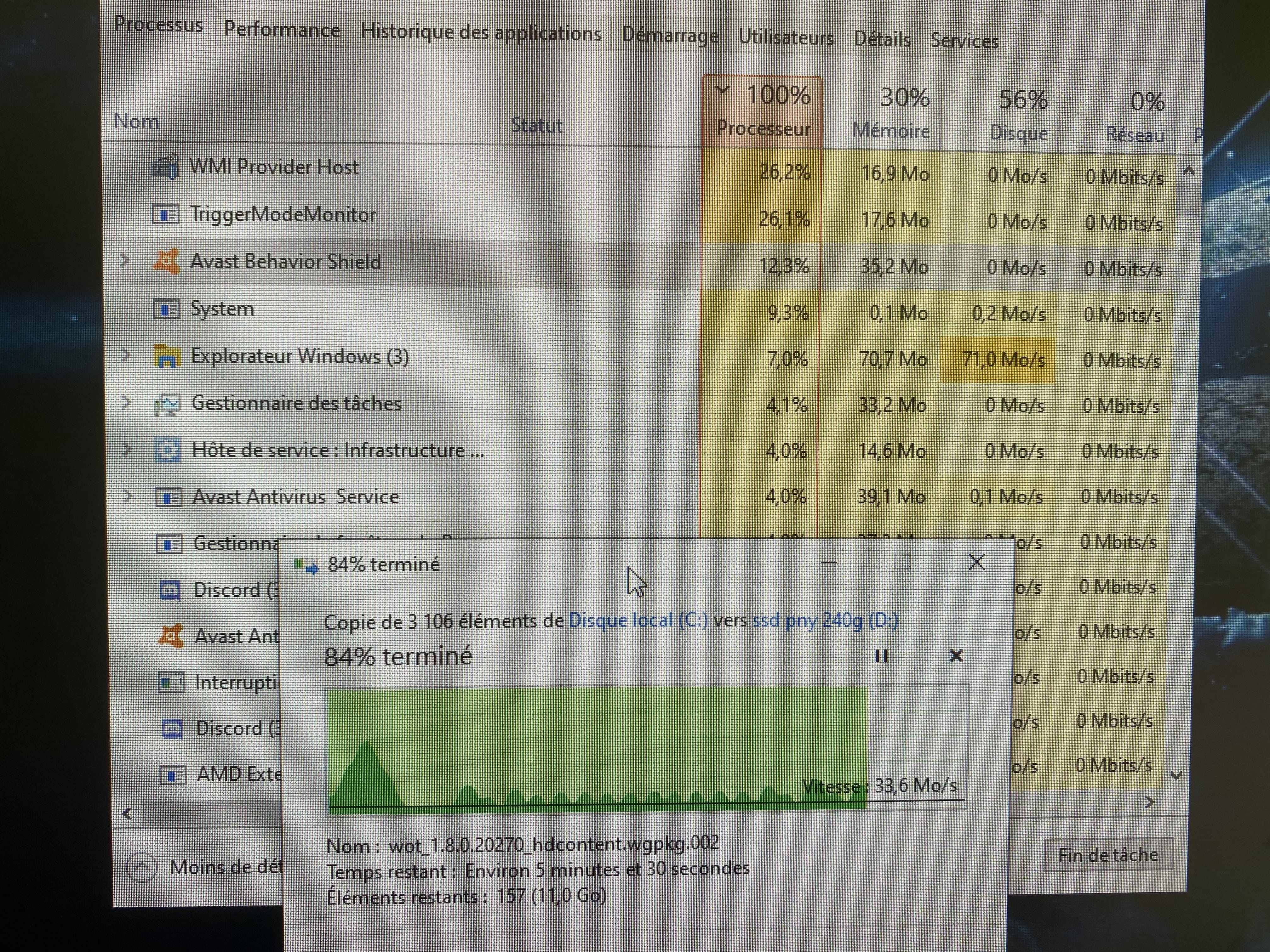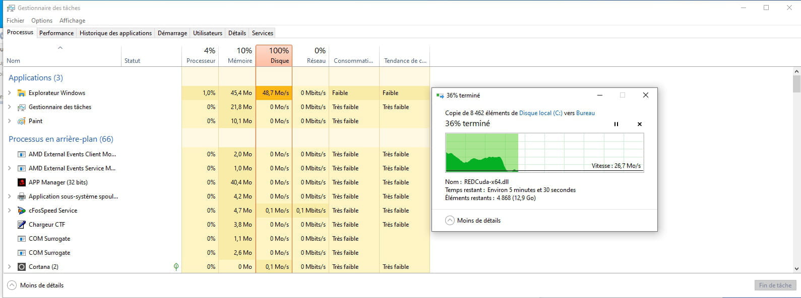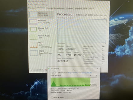 quand je lance un transfert sur celui ci l'activité processeur reste a 5% environ et l'activité du disque du monte a 100%.