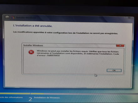 2: Suite cette erreur les problèmes continuent, impossible aussi d'installer windows 7 en boot sur clé USB, la partition sélectionnée risque de tomber en panne et l'installation est interminable (à la décompression des fichiers). J'utilise windows 7 édition familiale télécharger sur autre site car ma clé ne fonctionne pas car il a été preinstaller sur l'autre DD.