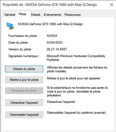 Bonjour, cela vient probablement d'une mise à jour mal installée. Ça arrive généralement sur les cartes graphiques secondaires (la première est intégrée au processeur, c'est une puce qui gère l'affichage général, et les jeux peux gourmands) Tu dois aller sur recherche, pour applications, la loupe en bas à droite, taper "gestionnaire de périphériques", cliquer dessus. Tu verras apparaître tous les périphériques et pilotes de ton ordinateur. Tu appuies ensuite sur "cartes graphiques". C'est dans la liste. Tu ne clique pas sur la première case, c'est généralement la puce graphique du processeur. Tu clique sur ta carte graphique pour jouer, tu vas dans pilotes, et restaurer le pilote, si tu ne peux pas, tu supprimes le pilote. Il te faudra une mise à jour pour le réactiver (quand tu supprime le pilote, tu l'enlève de ton pc, heureusement, après une mise à jour, cela fonctionne. j'ai fait pareil). J'espère que ça t'aidera