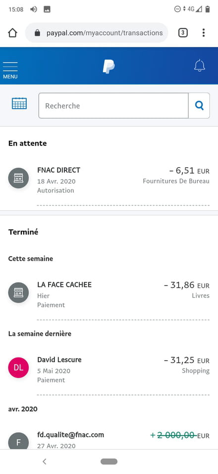 D'ailleurs je n'ai pas reçu de remboursement car cette transaction ne s'est pas faite, le site commerçant fnac n'a rien débité et paypal croit que c'est un remboursement en cours et me met en attente. Depuis début avril.