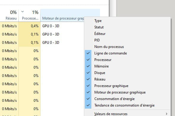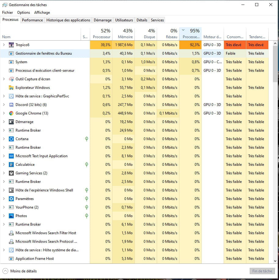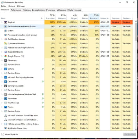Salut, c'est anormal. Pourquoi la carte graphique est utilisée à 99,7% Si vous êtes sur Windows 10, allez dans le gestionnaire des tâches, faites clique droit sur la barre avec Nom, CPU, RAM, etc.. Cochez les options « Processeur graphique » ainsi que « Moteur de processeur graphique », cliquez sur « Proceseur graphique », regardez ce qui utilise le plus en ayant à côté "GPU 1".
