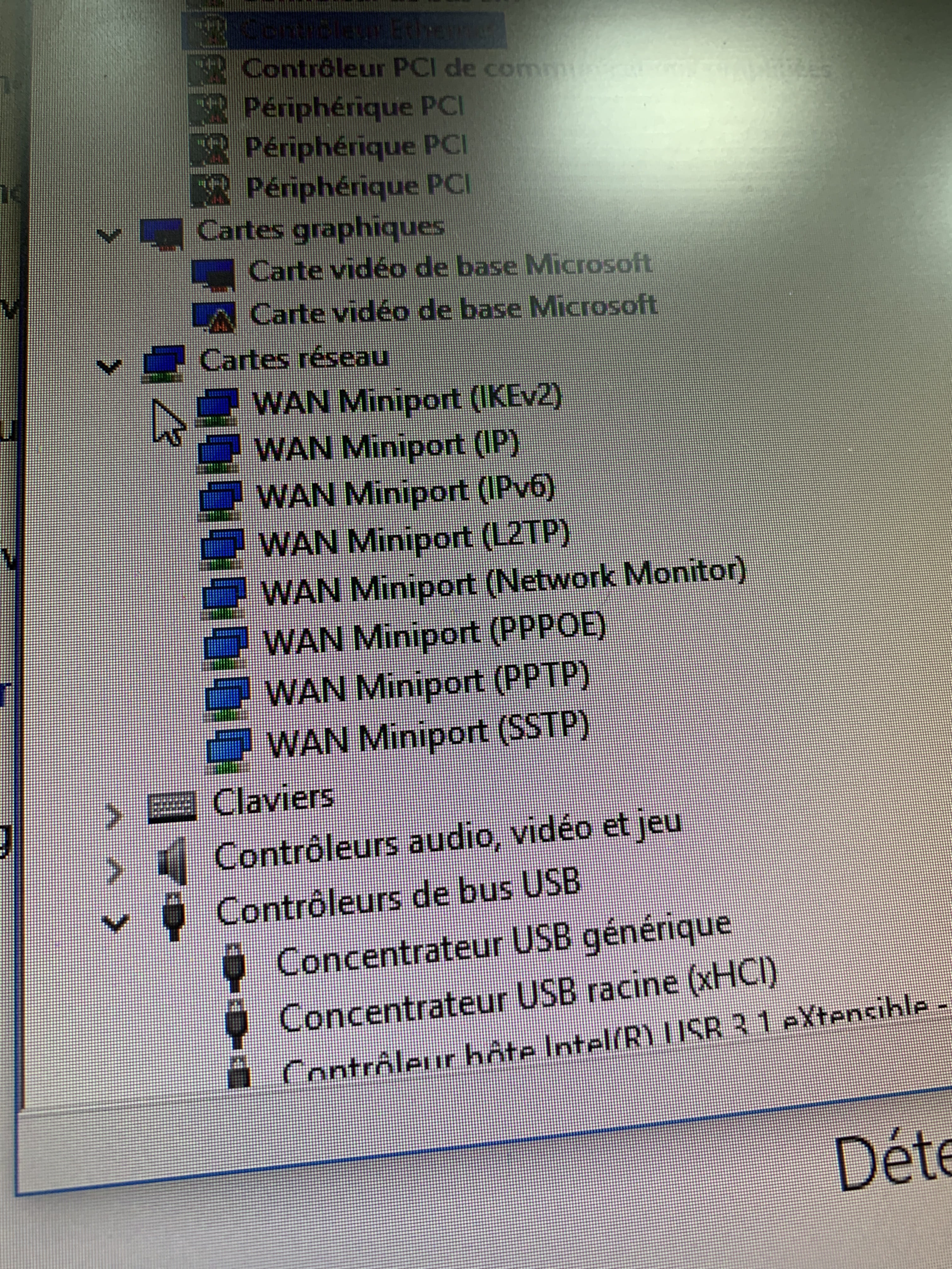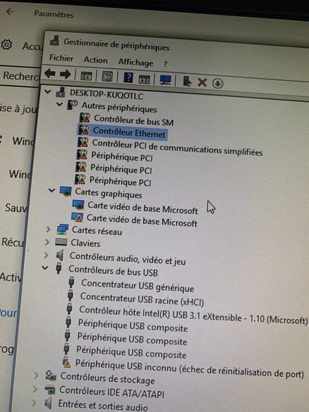 Dans ton gestionnaire de périphériques, tu as déroulé une rubriques appelée Autres périphériques. En bas, il y a la rubrique Cartes réseau . Tu fais la même chose que ce tu as fait au-dessus. D'ailleurs, on voit que tu as beaucoup de problèmes de pilotes (triangles jaunes). Il faudrait, vraisemblablement, faire une mise à jour du chipset de ta CM.