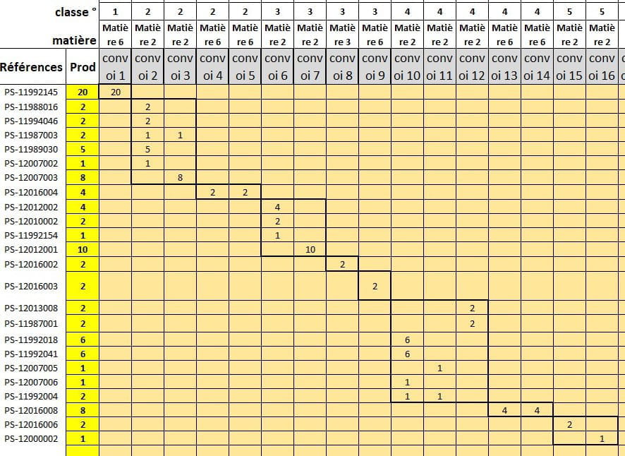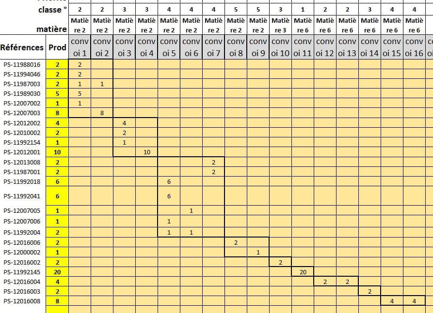 Et tu me retournes le classeur avec le tableau issu de l'optimisation et, à côté, le tableau "réarrangé". Et tu n'oublies pas les règles de gestion (description du processus décisionnel qui t'a amené à cette réorganisation du convoyage).
