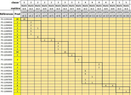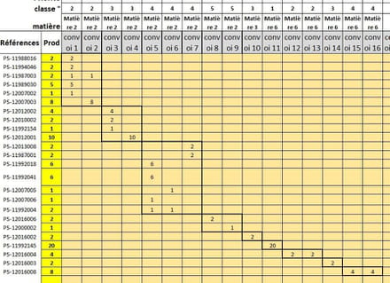 Ton nombre total de ref (que tu as regroupé en une colonne en haut de la feuille) te donnes ton nombre de ligne de ta matrice qui détaille le remplissage. Mais pour l'histoire du nombre de colonnes, que l'on obtenait via le nb de conteneur quand on le faisait à la main, je ne vois pas comment tu le génère. Ou alors vu que tu me parlais de matrice, tu fais une multiplication du nombre de ref par le nombre à produire qui te donne ton nombre de colonnes pour chaque étape ?