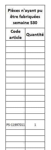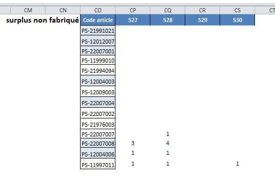 2) en CM27:CN126 j'ai ajouté des formules qui identifient les pièces qui n'ont pu être fabriquées dans une semaine.