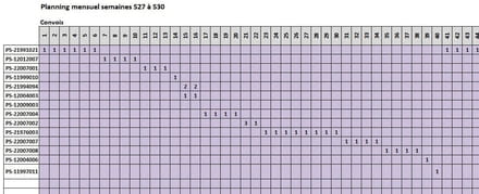 Une fois les différentes combinaisons obtenues, elles seront « redirigées » via rechercheV ou Equiv dans un onglet « planning » pour détailler comment s’organise les conteneurs au jour sur la semaine pour être envoyé plein en fin de journée. (Ex combinaison 1 rempli le lundi pour être envoyé le et combinaison 2 pour envoyer le mardi soir)