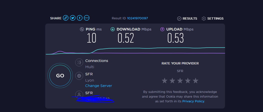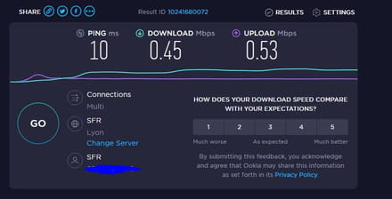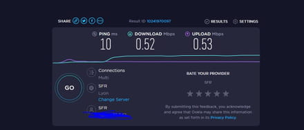 Je suis chez SFR, avec un débit fibre optique. Le problème étant pour je ne sais quelle(s) raison(s) ma carte réseau bride ma connexion internet (ce que je suppose ou alors elle est défectueuse). J'ai déjà essayé de mettre tout les pilotes possibles et inimaginables a jour mais rien ne marche. Pourtant quand je vérifie le statut de ma clé wifi on m'affiche bien 144mbp/s mais le speedtest m'indique 0.50mbp/s...
