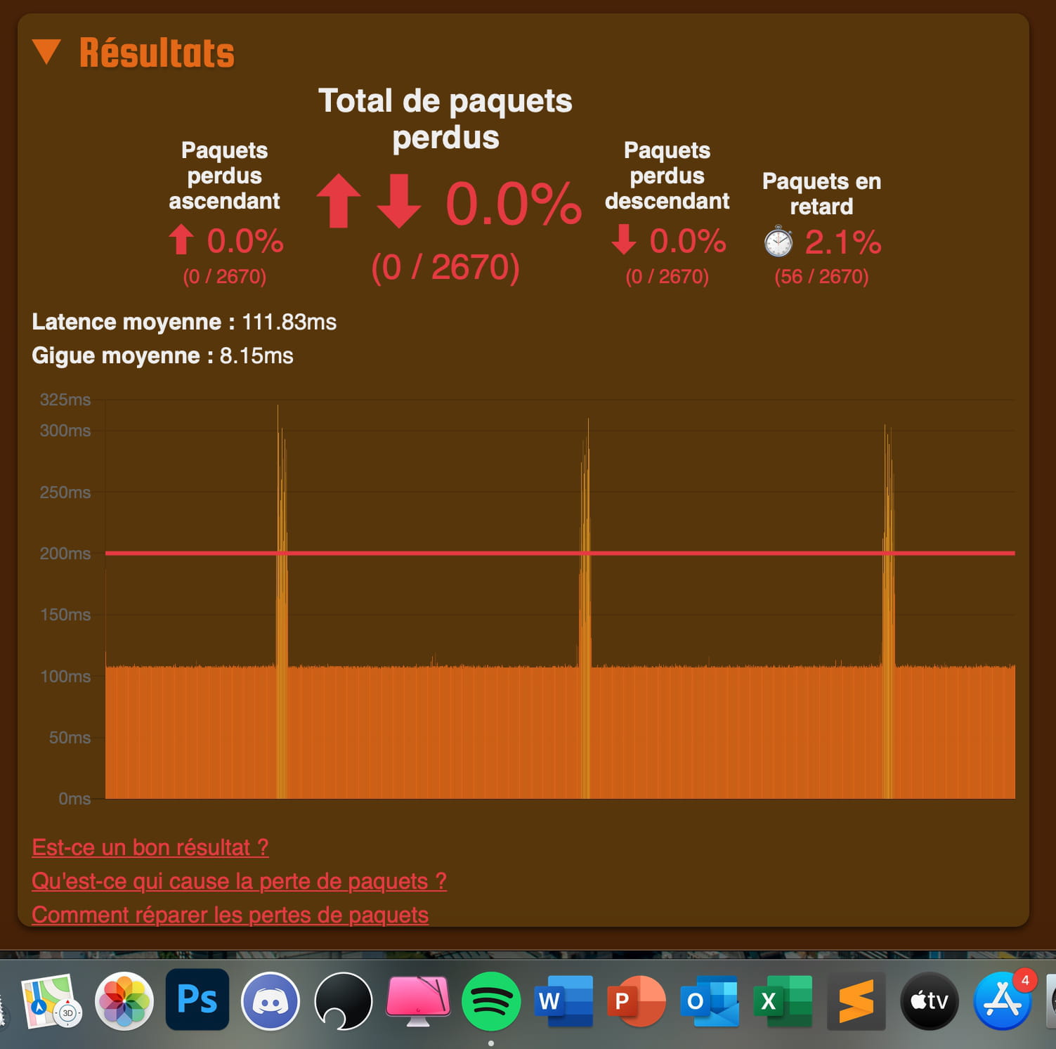 Votre outil ont dirait, qu'il calcule que le ping perte de paquets etc .. et pas la connexion en général ? Sur le résultat il y à aucune perte de paquets, mais des paquets qui arrive en retard