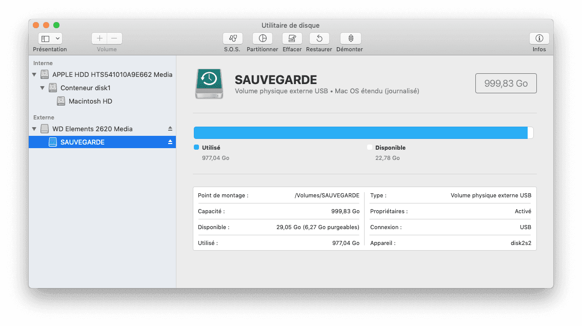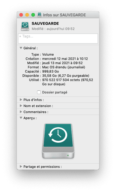 Le disque interne fait 500 Go. Le disque de sauvegarde fait 1 To et je viens de le mettre en service, pourtant il a l'air déjà plein. Utilisé: 970 Go.