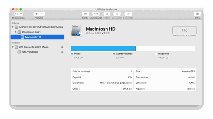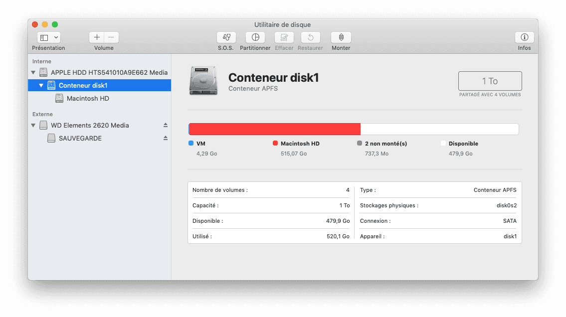 En voyant ces copies d'écran, (conteneur dsik1), on à l'impression que le disque interne physique est un disque de 1 To et non de 5OO Go, car Utilitaire de disque indique qu'il reste 479,9 Go de libre. Macintosh HD semble être un disque contenu dans le conteneur disk1