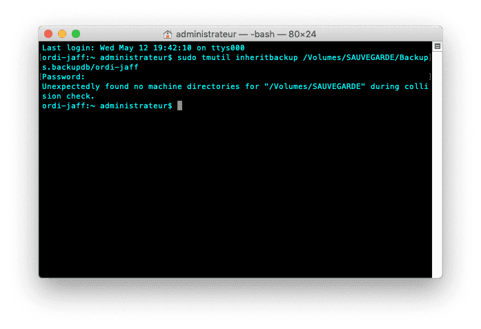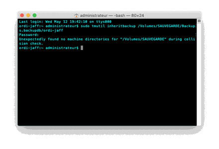 - glissez-déposez dans la fenêtre du Terminal, le dossier qui porte le nom de ton Mac et se trouvant à l'intérieur du dossier Backup.backupsdb du nouveau disque Time Machine
