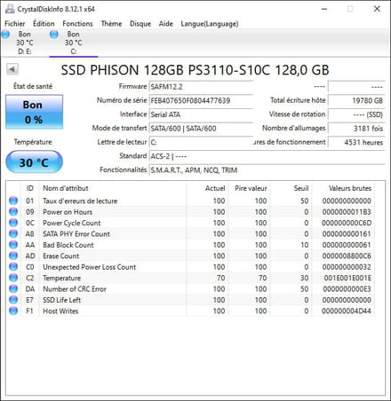Vous avez également " Hard Disk Sentinel " avec des résultats plus détaillés sur le nombre de secteurs détériorés et le pourcentage de défectuosité du HDD/SSD. a Télécharger ici