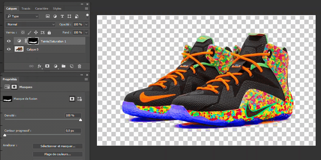 s'il vous plaît j'ai une photo de baskets sur photoshop quand je la manipule avec teinte et saturation je ne peux changer la couleur des baskets seules sans la semelle en la sélectionnant avec la pipette j'ai le droit juste de changer celle de la semelle toute seule , une autre question pourquoi il n'y a pas la couleur grise ,blanche et noire dans la teinte.