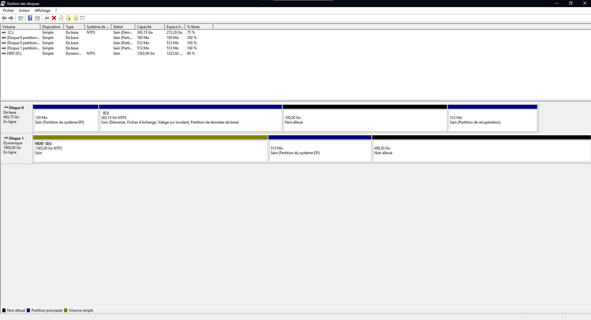 Cependant, je n'arrive pas à re allouer l'espace libre de mon HDD, et en tentant de le faire, je crois avoir fait une erreur (disque reconnu comme dynamique ?). Aussi, il ne me semblait pas qu'il y ait de partition "Partition du sytème EFI"). Pourriez-vous m'aider à ce sujet, je ne voudrais pas endommager mes disques