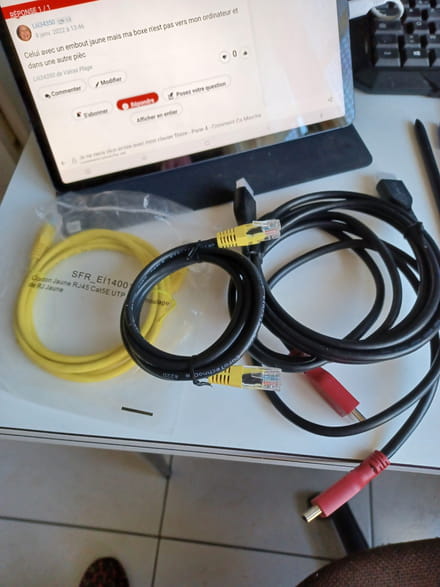 OK je vais aller près de ma box et brancher mon PC à côté euh par contre dis-moi quel Cordon je dois prendre j'en ai un tout noir avec des embouts jaune Un autre tout noir avec des embouts jaune et je crois que les 2 hot que j'ai ce sont des cordons hdmi