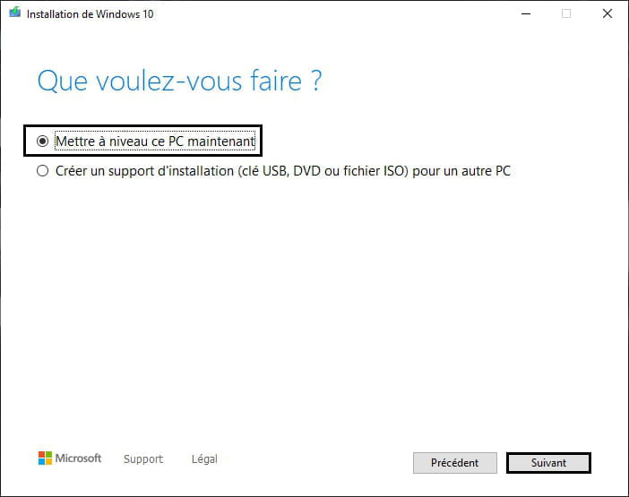 quand tu arrivras sur cette page, coche la case "mettre à niveau ce pc maintenant"