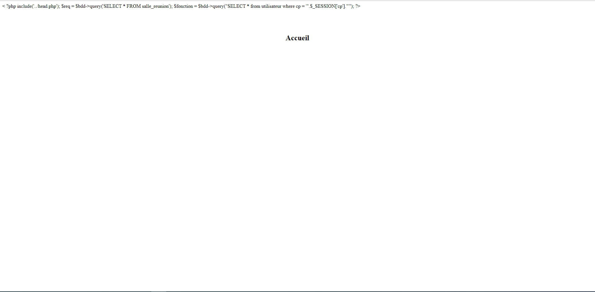 < ?php include('../head.php'); $req = $bdd->query('SELECT * FROM salle_reunion'); $fonction = $bdd->query("SELECT * from utilisateur where cp = '".$_SESSION['cp']."'"); ?>