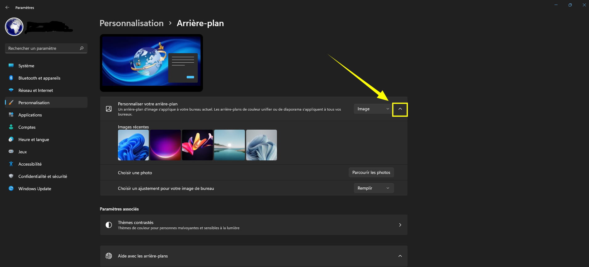 En allant dans la personnalisation de l'affichage, il me manque la section à cet effet (dans personnalisation - arrière plan, je n'ai rien. Juste un renvoi vers les thèmes).