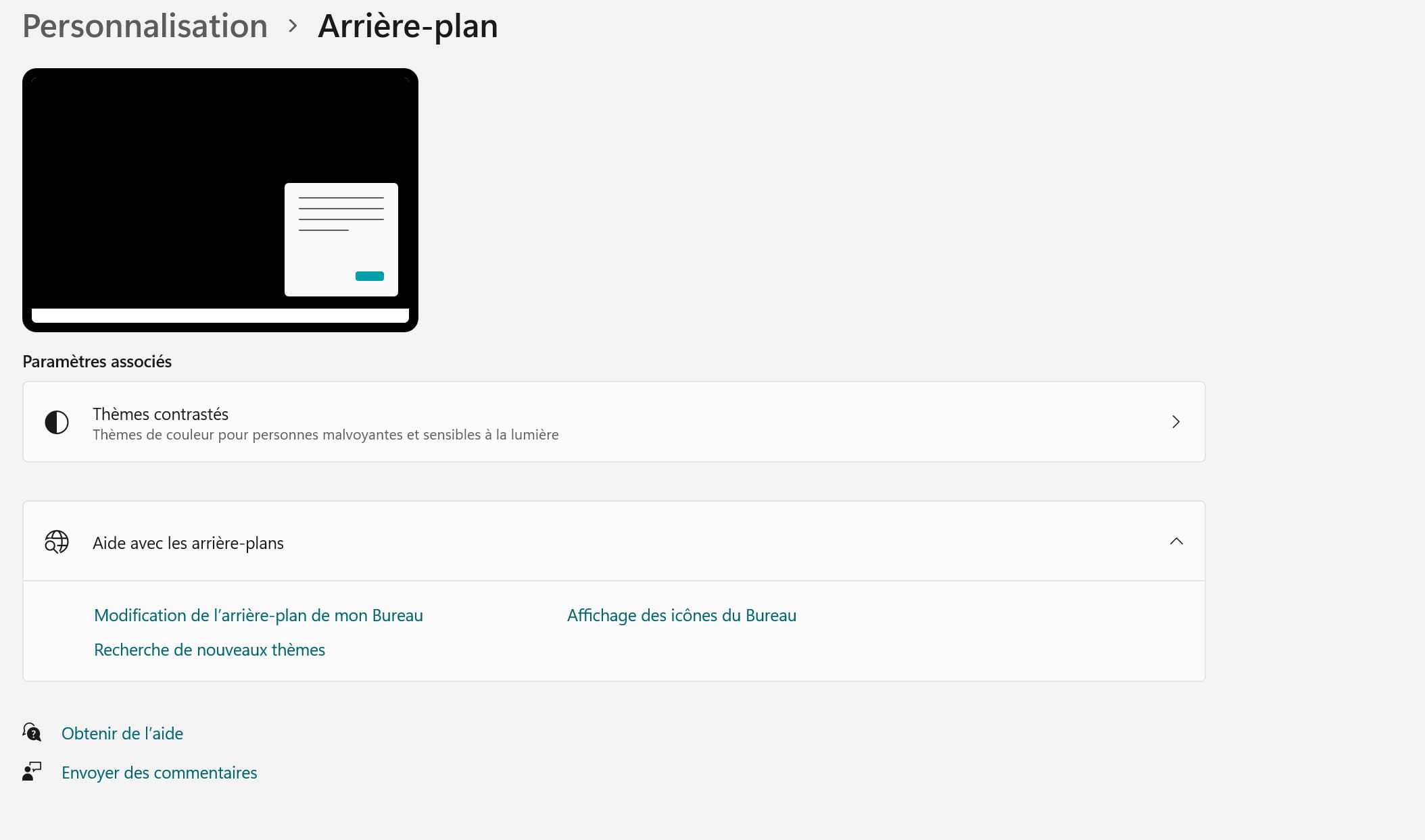 J'ai essayé de changer de thème, je vois que la barre des taches change de couleurs mais le fond d'écran reste noir malgré la présence d'un fond sur les thèmes choisis.