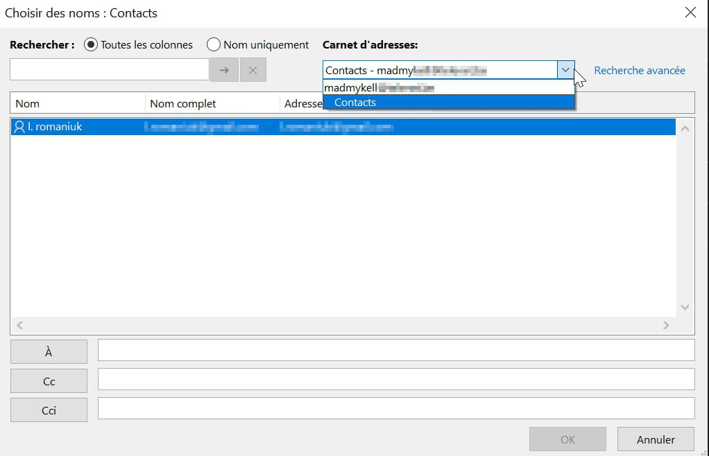 Quand je fais un nouveau message et que je recherche mon contact la liste de contacts n'est pas la même que dans mes contacts.