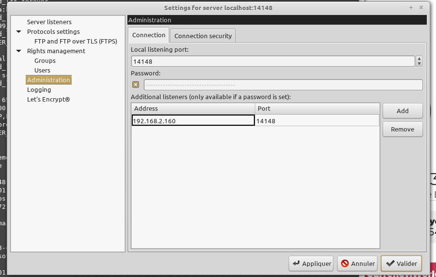 Là tu fais add et tu peux rentrer l'adresse ip v4 ou v6 de ton serveur que tu veux mettre en écoute dans une première zone et le port tcp dans une seconde, tu peux mettre ton 14148 comme sur localhost ou un autre si ça te chante.