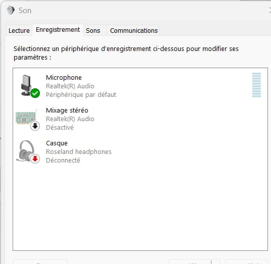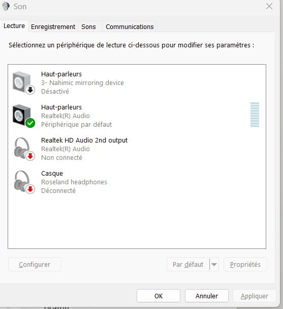 Posez votre questionDans onglet Lecture, as-tu Realtek (R) Audio (haut-parleurs) par défaut ?
