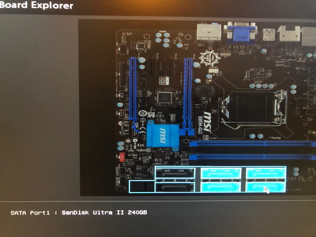 Pour plus de précisions, voici une image de la liste de choix de disque j'ai pour booter (le SSD n'y figure pas) alors que sur l'autre photo, on voit bien que la carte mère reconnais le SSD qui est en position SATA 1 sur la carte mère.