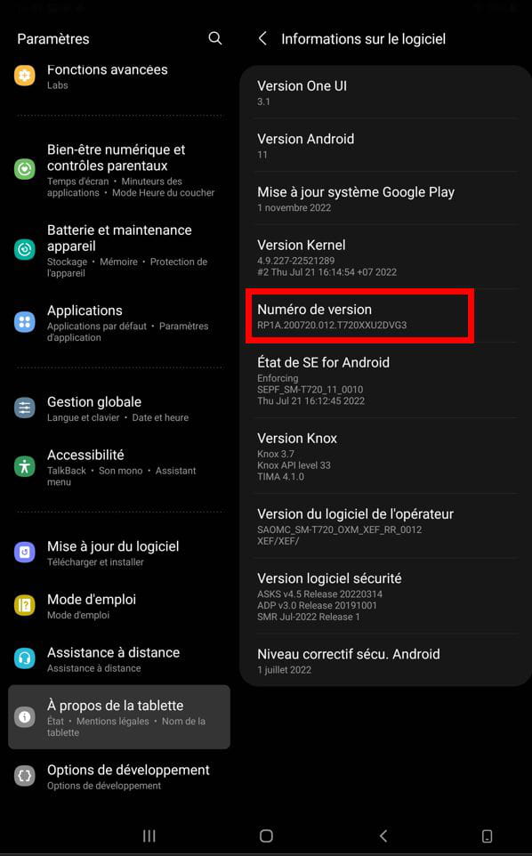 Vous tapotez Numéro de version (ou numéro de build) jusqu'à ce le que mode développeur soit activé. (Vous aurez un avertissement).