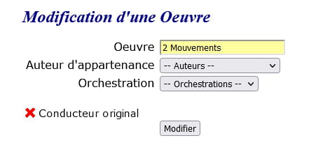 Bonjour, je me retrouve devant un problème que j'ai du mal à comprendre. J'ai une page PHP dont je saisie les oeuvres musicales avec un formulaire de 4 champs. 1 champ de type texte, 1 de type="checkbox et 2 champs avec liste déroulante issue de ma base de donnée. Lorsque je souhaite faire une modification je saisie le lien d'une œuvre pour effectuer la modification d'un enregistrement et malheureusement les 2 champs de liste déroulante me retourne les dernières valeurs de ses listes et non les valeurs concernés par l’œuvre sélectionnée. J'ai fait un var_dump et cela retourne bien le bon ID de l’œuvre et idem lorsque je survol les liens. Je vous remercie beaucoup pour votre aide. Voici le page concernée.