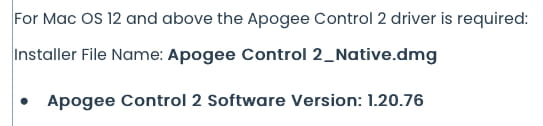 Est-ce que tu as regardé les indications (et téléchargements) sur le site d'Apogee, plus particulièrement cette page où il est indiqué que pour macOS 12.x il faut un pilote Apogee Control 2 :