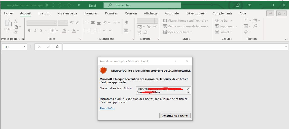 Mais Mon Ms bloque l'exécution du macros disant la source n'est pas sûr, comment puis-je contourner cela ou avoir le code source pour reproduire sur la vrai bdd.?